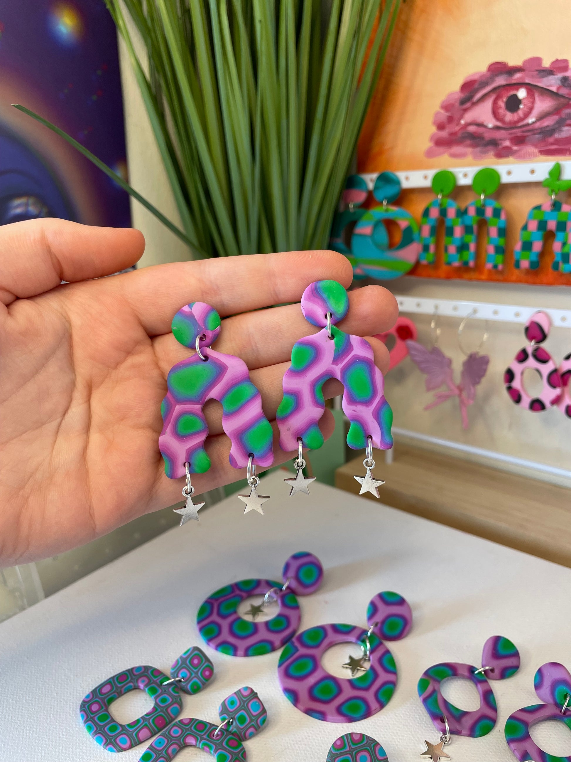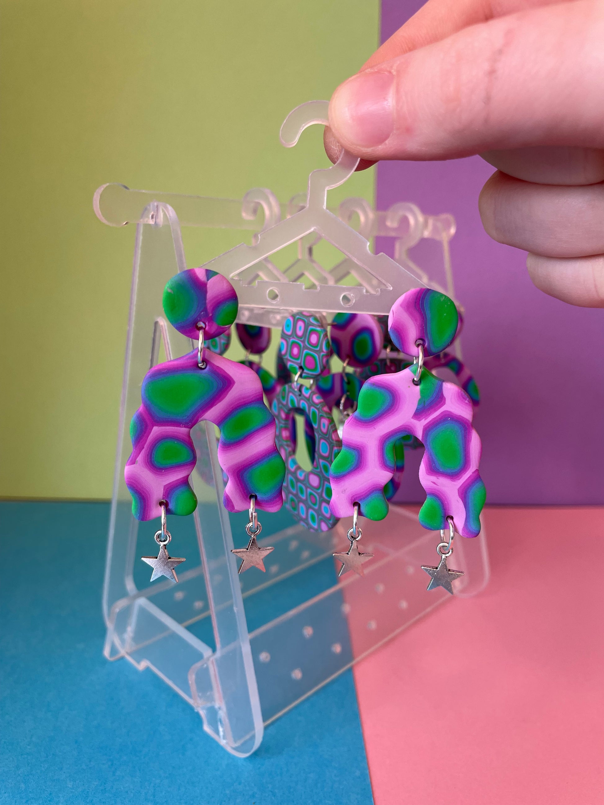 Handmade polymer clay earrings in funky futuristic pattern with silver plated star charms. Stud posts made from stainless steel. These groovy earrings stand out with any outfit you wear and add even more personality to your look! Fun colour scheme; green, blue and purple.