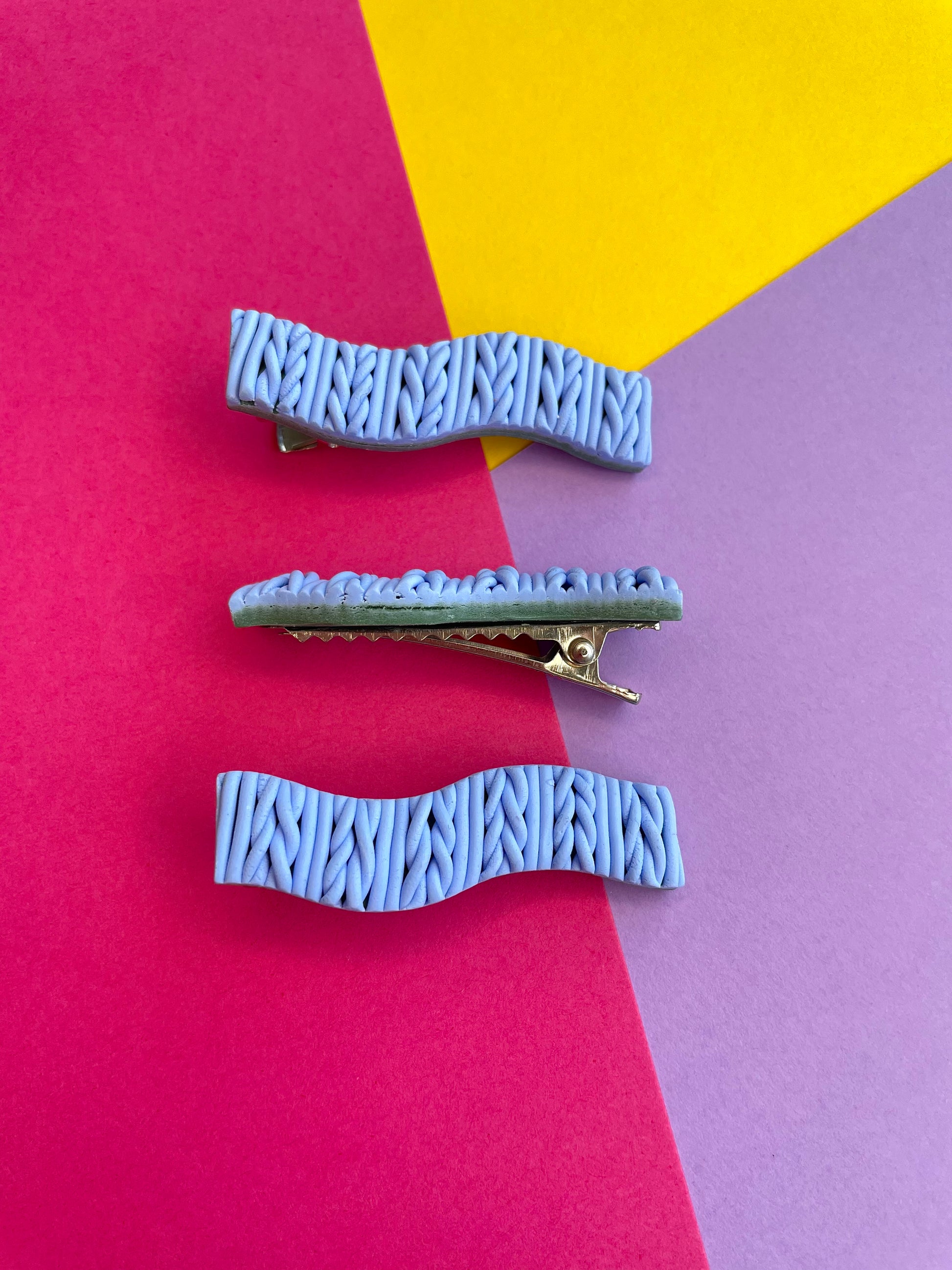 Handmade polymer clay hair clip in blue knitted pattern. This cute trendy barrette stands out with any outfit you wear and add even more personality to your look!