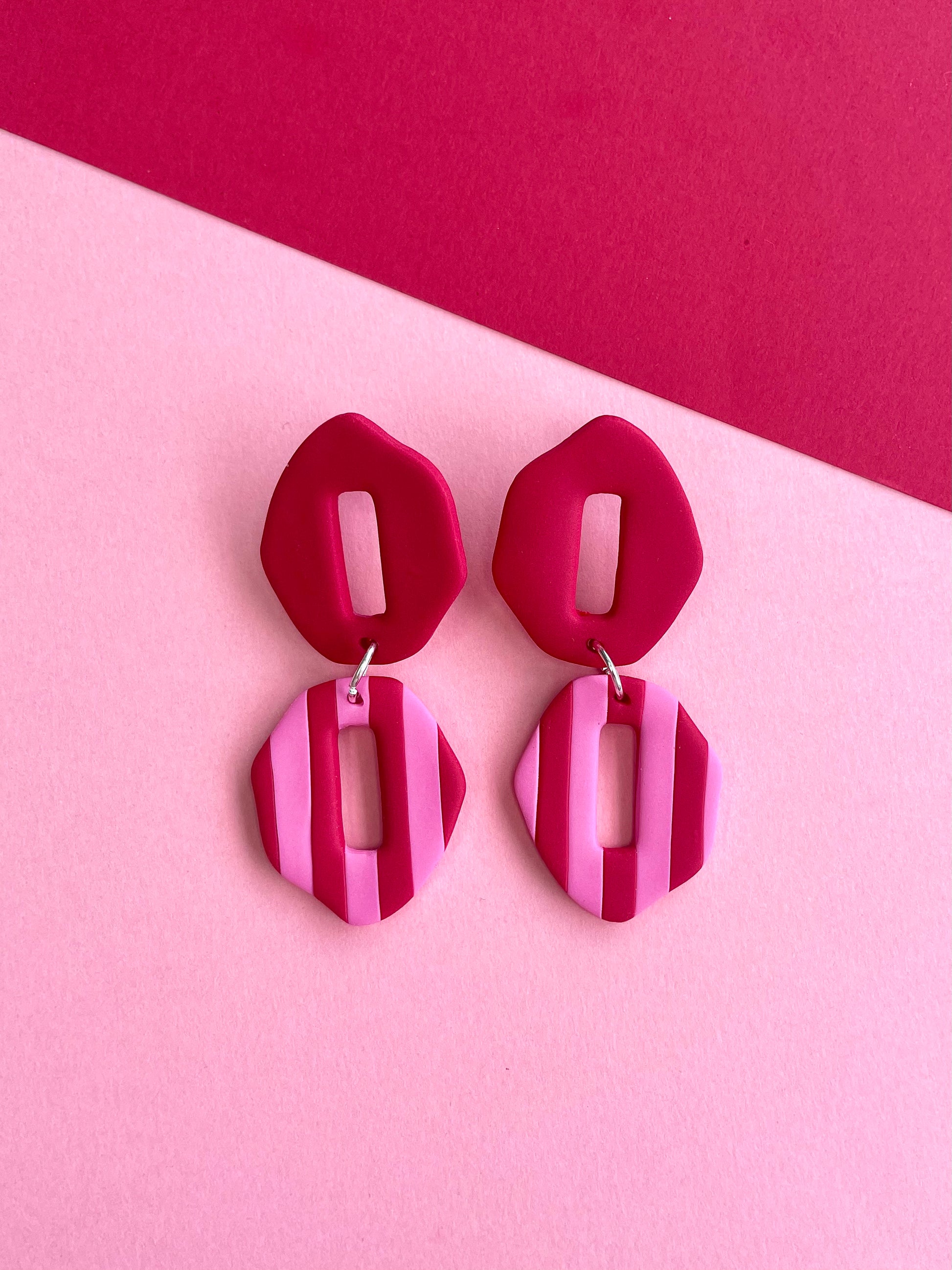 A funky, statement pair of earrings that will liven up your look! Using an iconic striped effect with a red and pink colour palette. Wear these studs with a simple outfit and let them pop, or have them be the finishing touch to your unique look!
