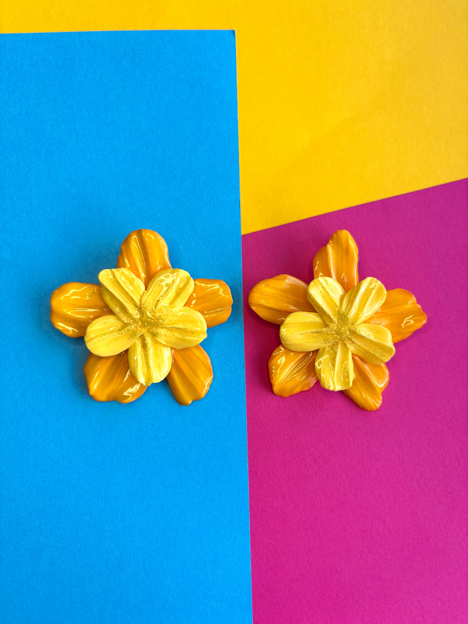 A gorgeous, statement pair of earrings that will liven up your look! Flowers never go out of style, so why not decorate your ear with stunning yellow flowers! As the material is polymer clay, you can get the look of a big earring without worrying about discomfort from the weight. Wear these studs with a simple outfit and let them pop, or have them be the finishing touch to your unique look!